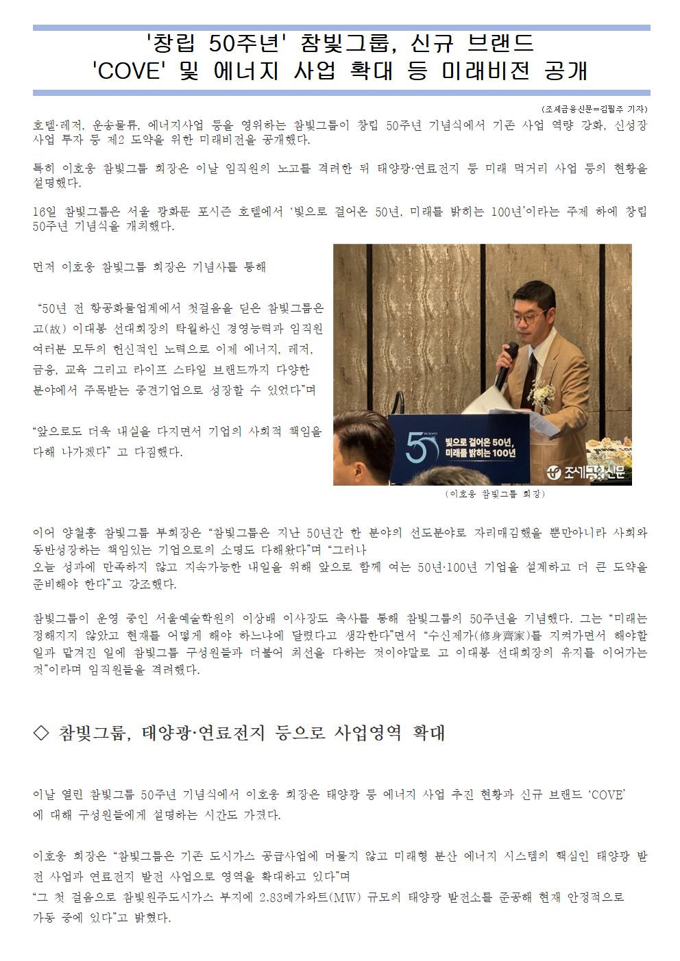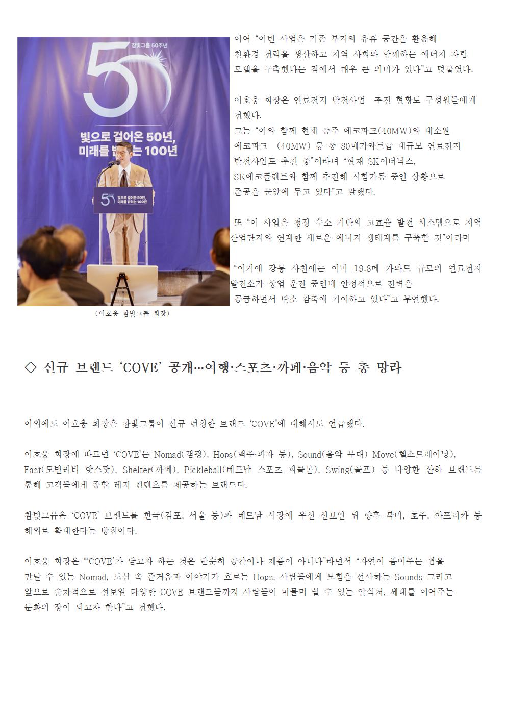 '창립 50주년 '참빛그룹, 신규 브랜드 'COVE' 및 에너지 사업 확대 등 미래비전 공개